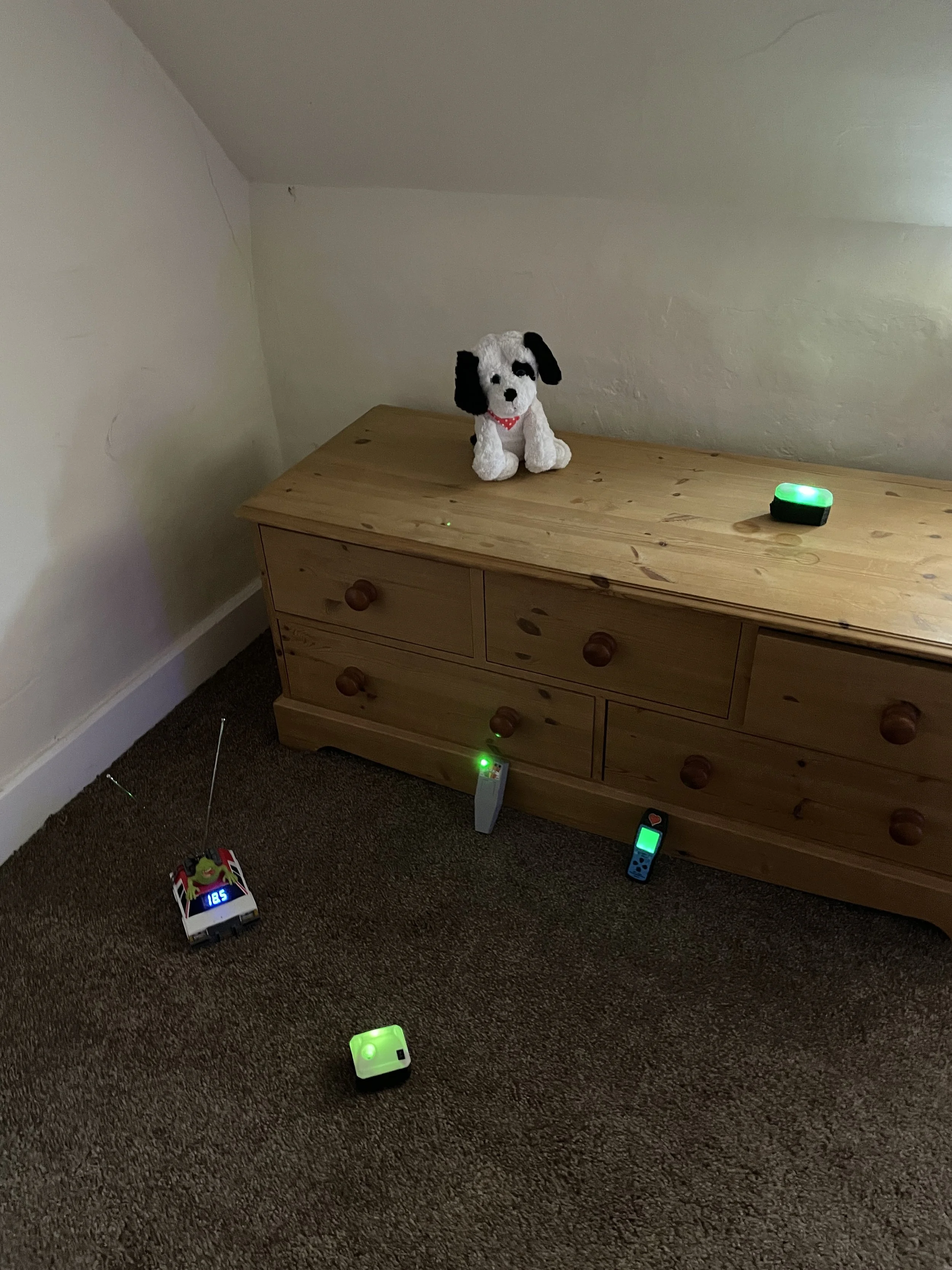 Middle room again, like the cat's balls, the teddy bear was set off and the touch was turning on and off by itself. This also happened when we left them in the room while investigating somewhere else.